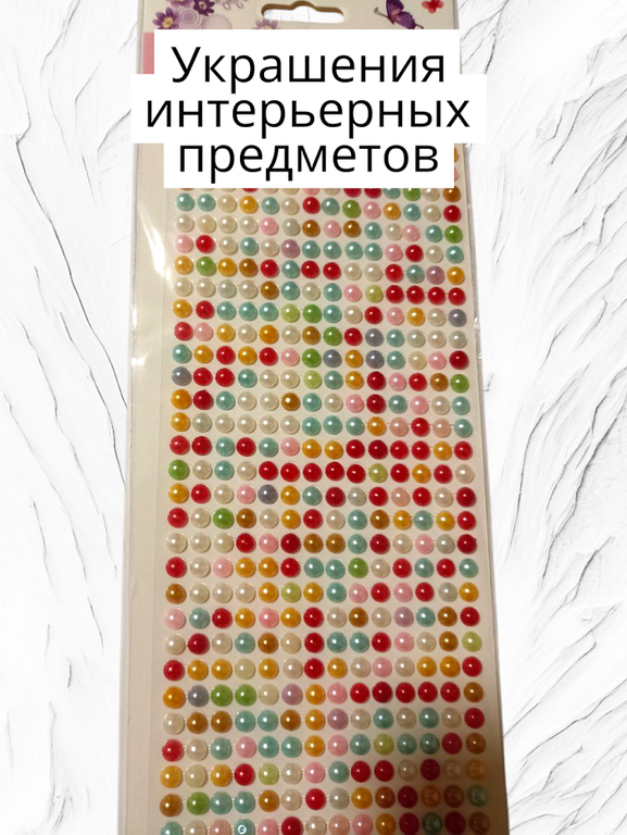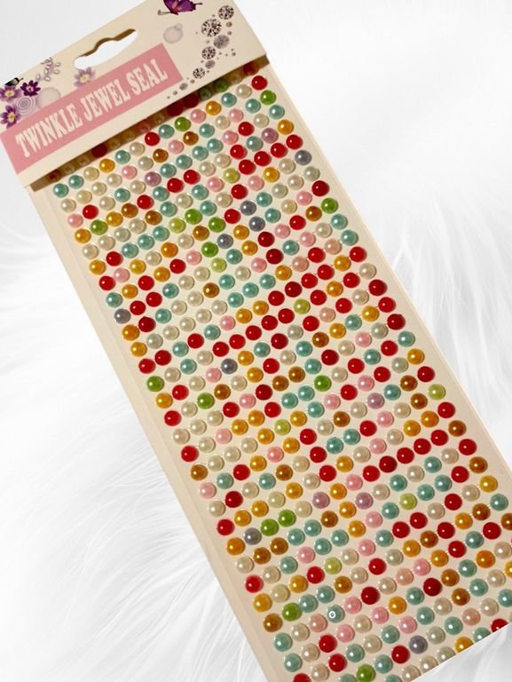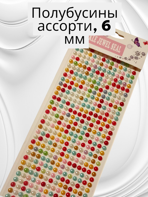 Самоклеящиеся декоративные полубусины диаметром 6 мм. Цвета в ассортименте (как на фото). Материал: смола. Продаются цельными листами, на которых расположено много элементов (от 50 шт. и более, в зависимости от плотности). Главная особенность: уже имеют нанесенный клеевой слой под защитной бумагой, что делает процесс декорирования быстрым и удобным. Идеальны для скрапбукинга, декупажа, handmade-поделок и детского творчества.