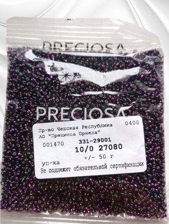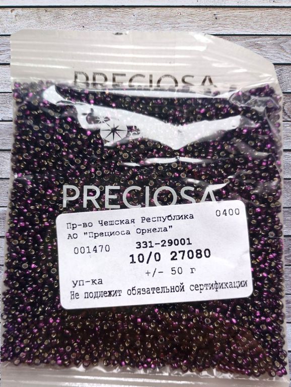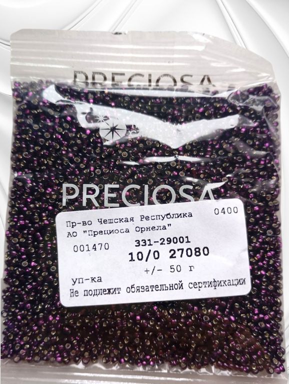 Размер 10/0, цвет прозрачный с серебристой серединкой, аметистовый огонек (27080), продается фасовкой по 50 грамм. Производитель: Прециоза, Чехия.