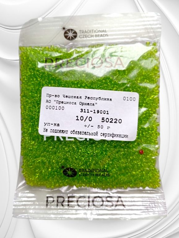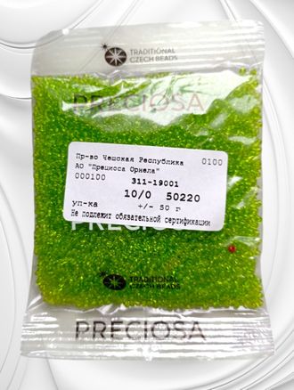 Размер 10/0, цвет салатовый прозрачный (50220), продается фасовкой по 50 грамм. Производитель: Прециоза, Чехия.