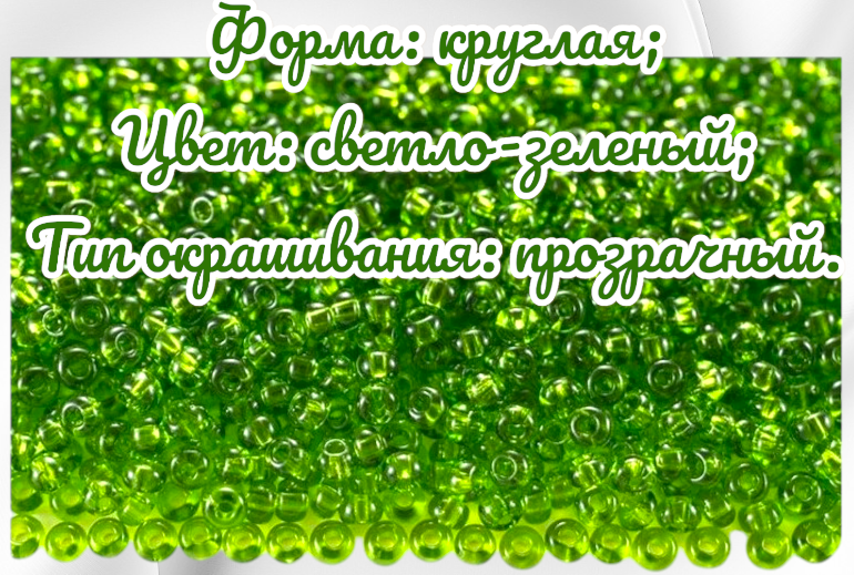 Бисер Чешский 50220 расфасован в заводские пакетики по 50 грамм, салатовый прозрачный. Размер 10/0 подходит для вышивания картин, изготовления ювелирных изделий и других всевозможных поделок. Бисер Чешской фирмы Preciosa известен качеством - на 10 грамм бисера приходится не больше 0.8% брака, что не может не радовать покупателей интернет-магазина Штучка. Дырочки аккуратно проделаны, краска с бисерин не спадает, отполирован и каждая бисеринка идентична другой по форме, покрытию и размерам. Чешский размер 10/0 означает диаметр бисеренинок 2,2-2,4 мм, отверстие 0,7-0,8 мм.