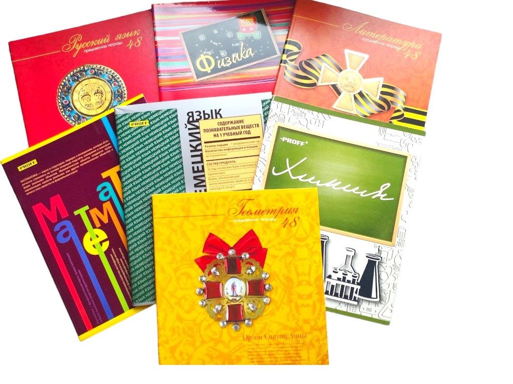 Комплект из семи предметных тетрадей формата А5 состоит из 48 листов. В набор входят тетради по литературе, геометрии, химии, немецкому языку, математике, физике и русскому языку.