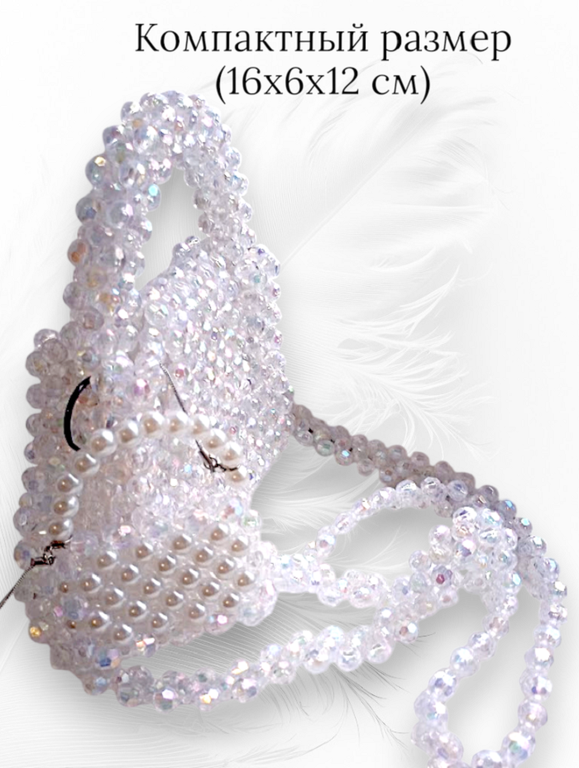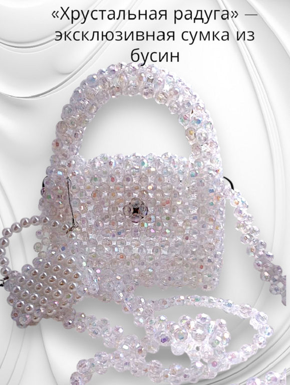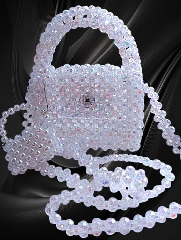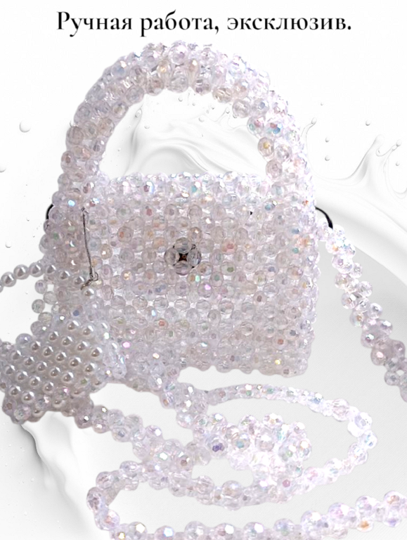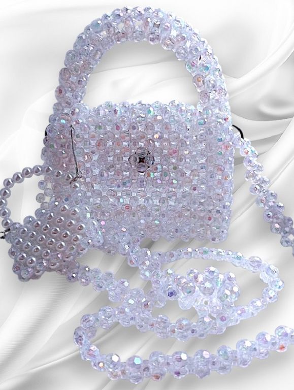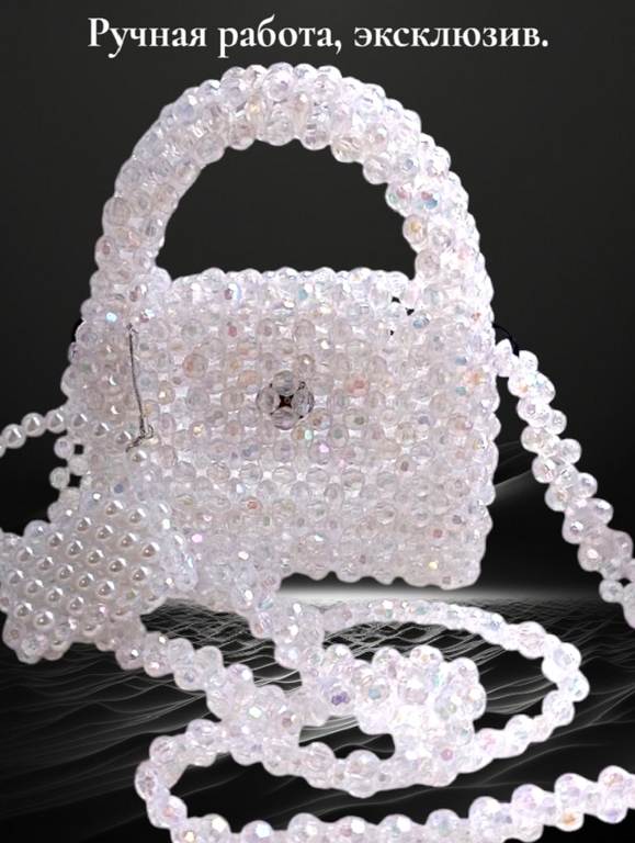 Позвольте себе сиять! Эта сумка — не просто аксессуар, а настоящее волшебство, застывшее в бусинах. Изысканный белый цвет переливается всеми оттенками радуги, словно соткан из утреннего света и хрустальной росы.