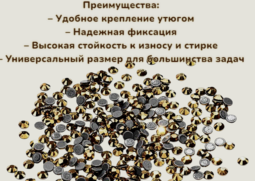 Термоклеевые стразы цвета «золотистый металлик» — идеальный вариант для тех, кто хочет добавить яркий, элегантный акцент в образ или изделие. Размер SS16 (3,8–4,0 мм) — один из самых востребованных: оптимален для декора одежды, обуви, аксессуаров, сценических и танцевальных костюмов, а также для рукоделия и нейл-дизайна.