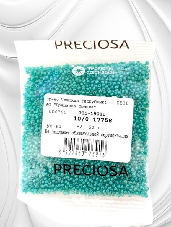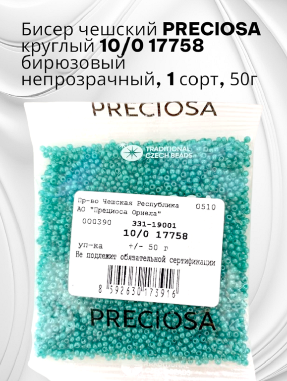 Бисер чешский PRECIOSA круглый 10/0 17758 бирюзовый непрозрачный, 1 сорт, 50г