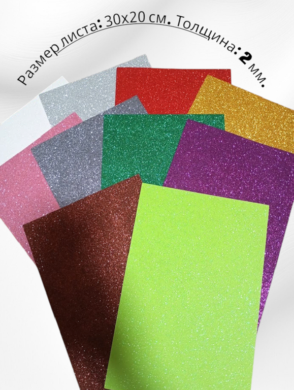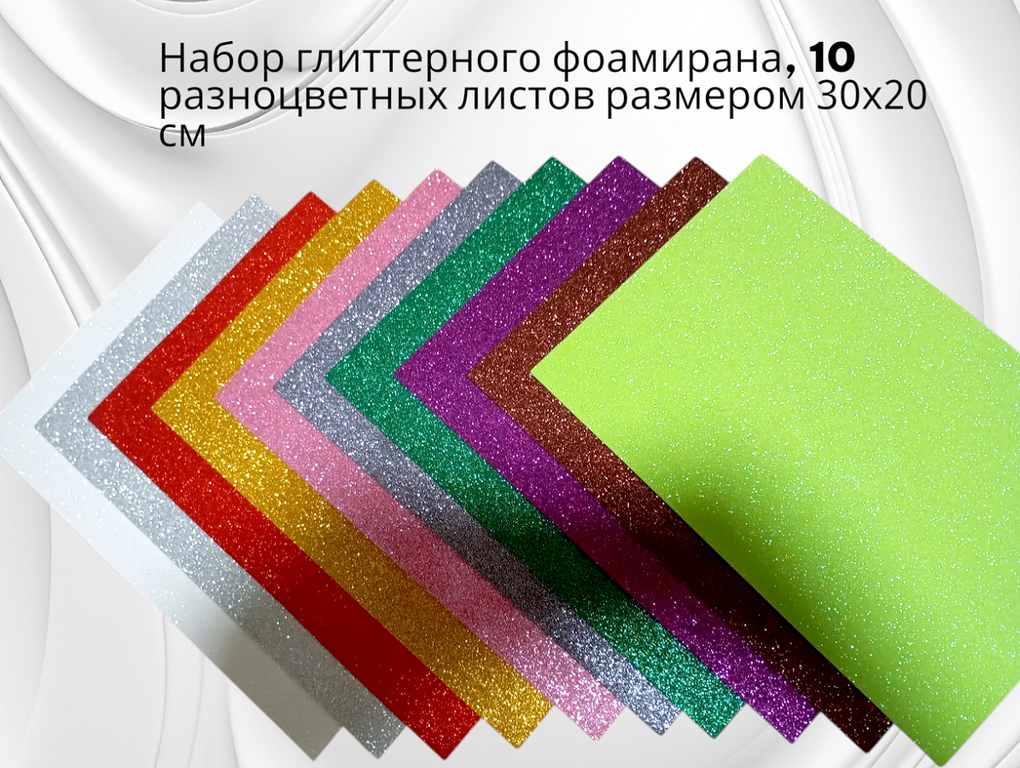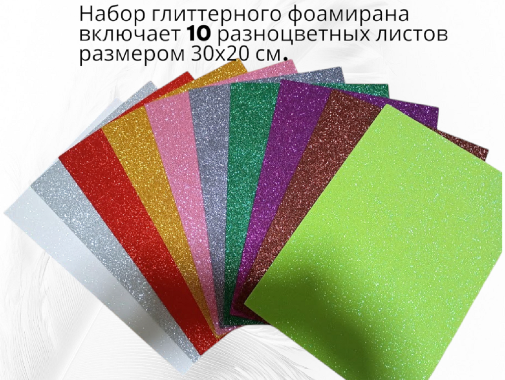 Набор глиттерного фоамирана включает 10 разноцветных листов размером 30х20 см. Каждый лист украшен мерцающим глиттером, что придает ему уникальный и блестящий вид. Этот набор идеально подходит для скрапбукинга, создания украшений, декора и других творческих проектов.