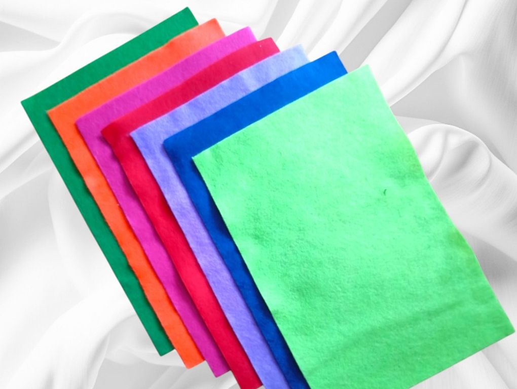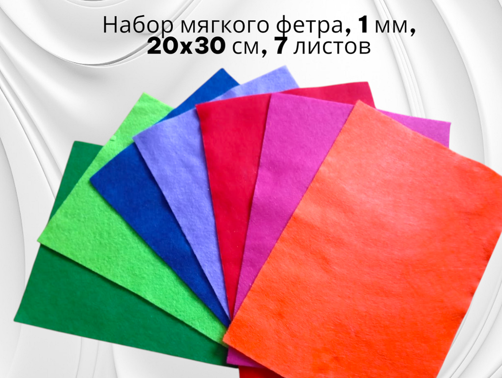 Набор фетра цветной, 7 листов 20x30 см, 1 мм (7 цветов: зеленый, оранжевый, розовый, красный, салатовый, синий, фиолетовый).