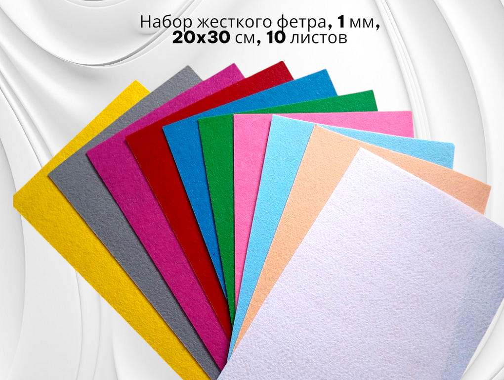 Этот набор станет основой вашей творческой мастерской! В нём собраны 10 классических и модных цветов фетра, каждый из которых представлен отдельным листом удобного формата А4 (20x30 см). Плотность 1 мм — идеальный баланс между гибкостью и формостойкостью для любых проектов.