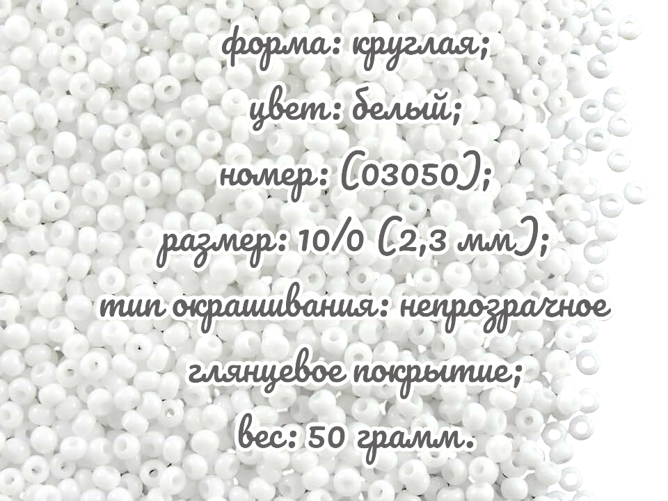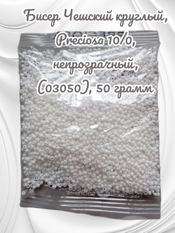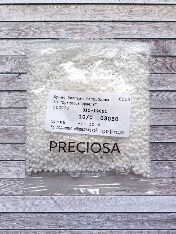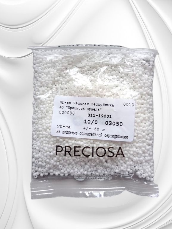 Размер 10/0, цвет белый (03050), продается фасовкой по 50 грамм. Производитель: Прециоза, Чехия.