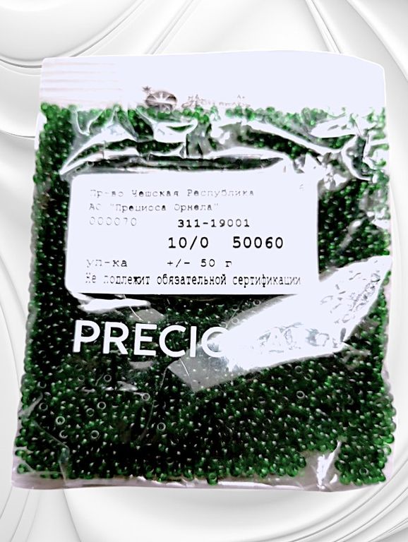 Размер 10/0, цвет зеленый (50060), продается фасовкой по 50 грамм. Производитель: Прециоза, Чехия.