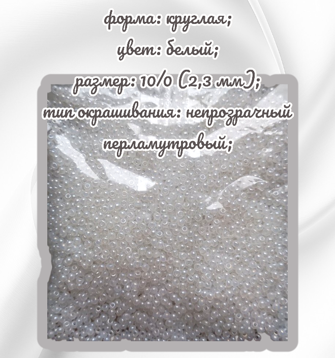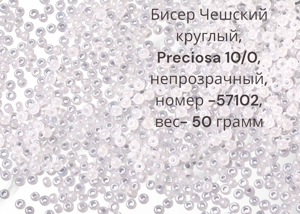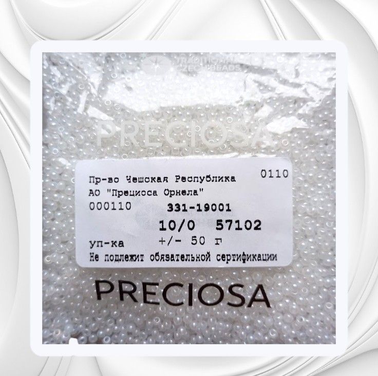 Размер 10/0, цвет белый (57102), продается фасовкой по 50 грамм. Производитель: Прециоза, Чехия.