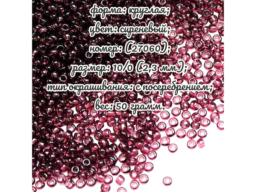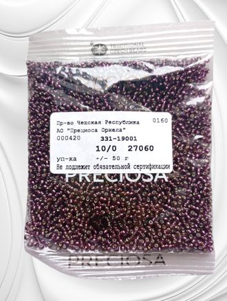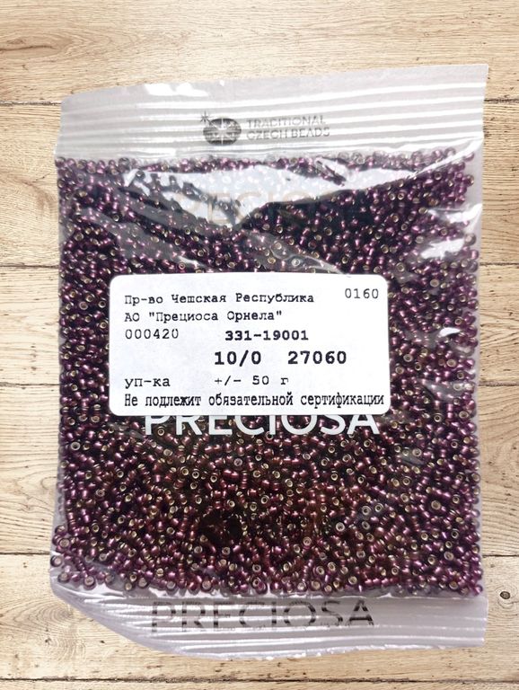 Размер 10/0, цвет непрозрачный лиловый с внутренним посеребрением, (27060), продается фасовкой по 50 грамм. Производитель: Прециоза, Чехия.