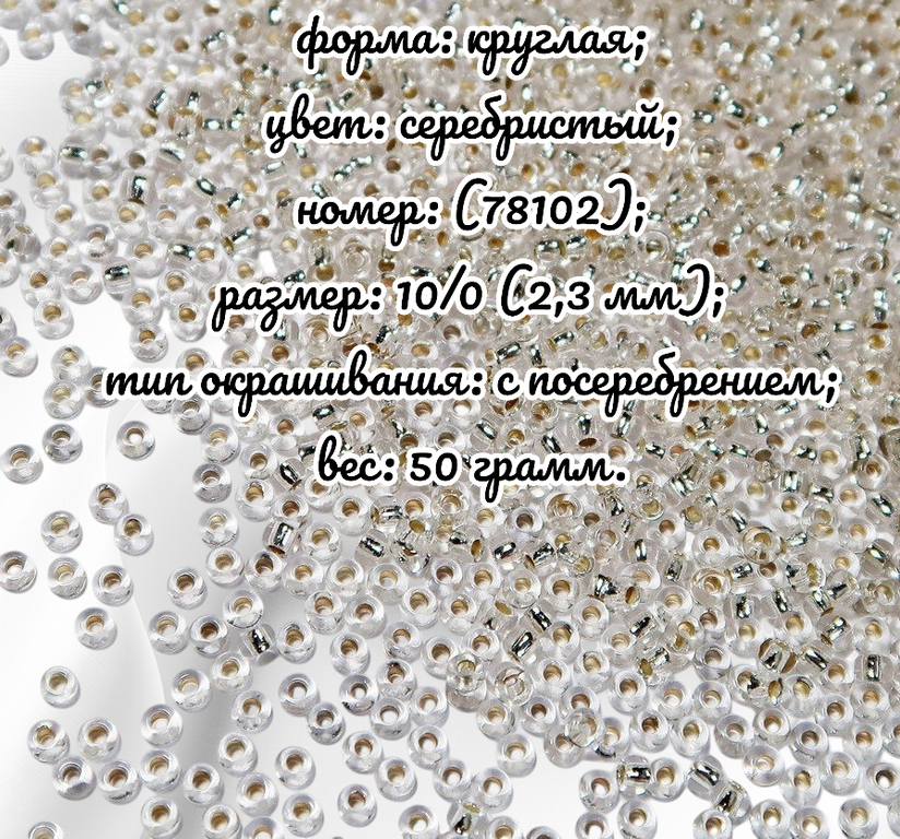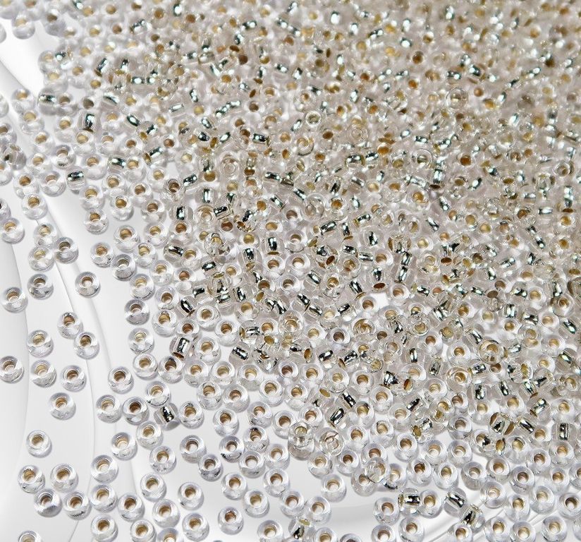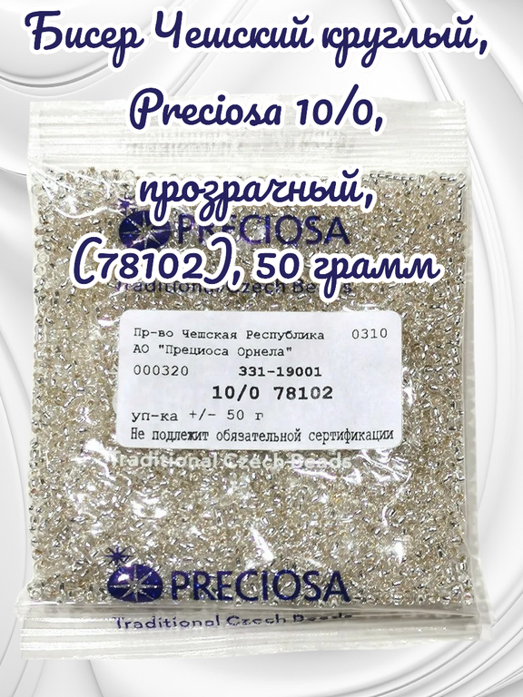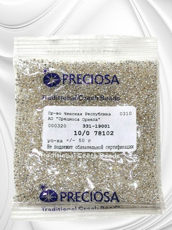 Размер 10/0, цвет прозрачный с внутренним посеребрением, серебро (78102), продается фасовкой по 50 грамм. Производитель: Прециоза, Чехия.