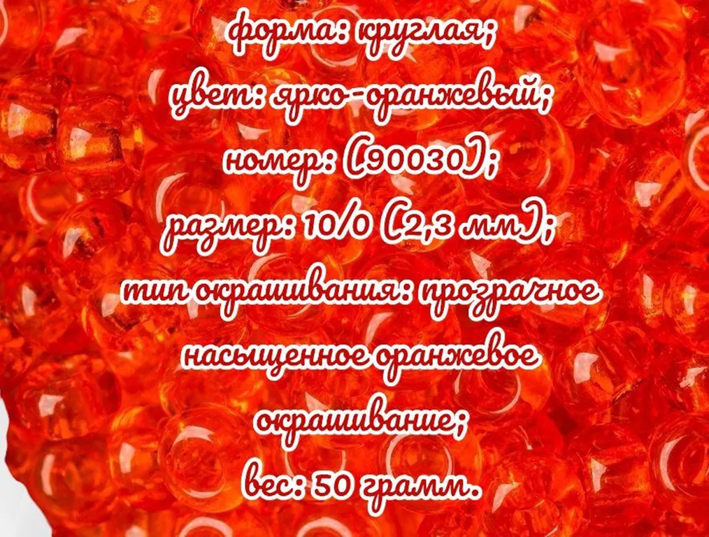 Размер 10/0, цвет ярко-оранжевый (90030), продается фасовкой по 50 грамм. Производитель: Прециоза, Чехия.
