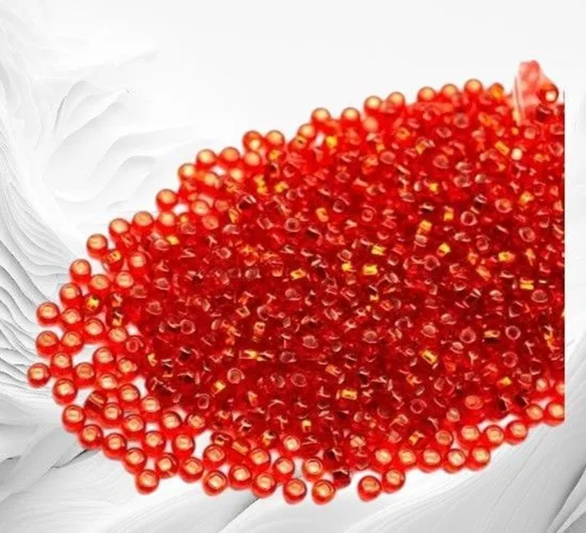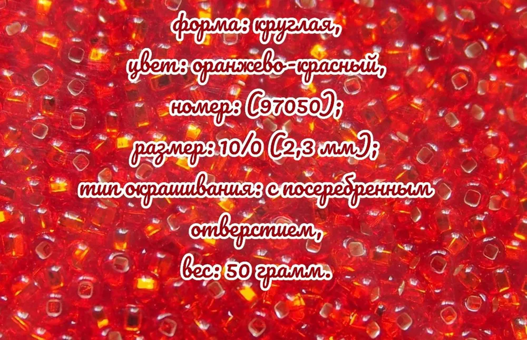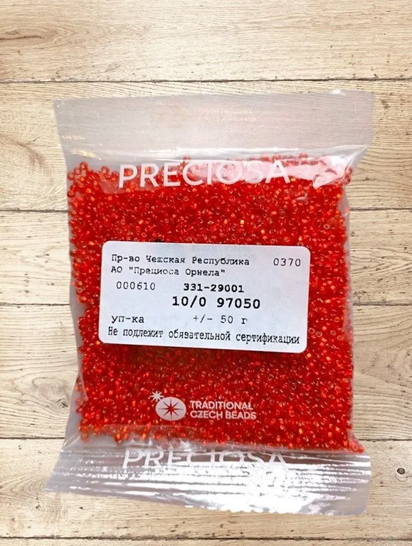 Размер 10/0, цвет оранжево-красный с квадратным отверстием (97050H), продается фасовкой по 50 грамм. Производитель: Прециоза, Чехия.