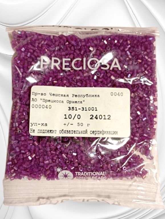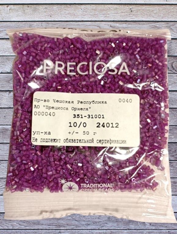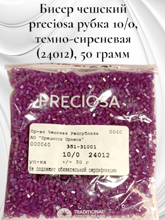 Размер 10/0, цвет темно-сиреневая (24012), продается фасовкой по 50 грамм. Производитель: Прециоза, Чехия.