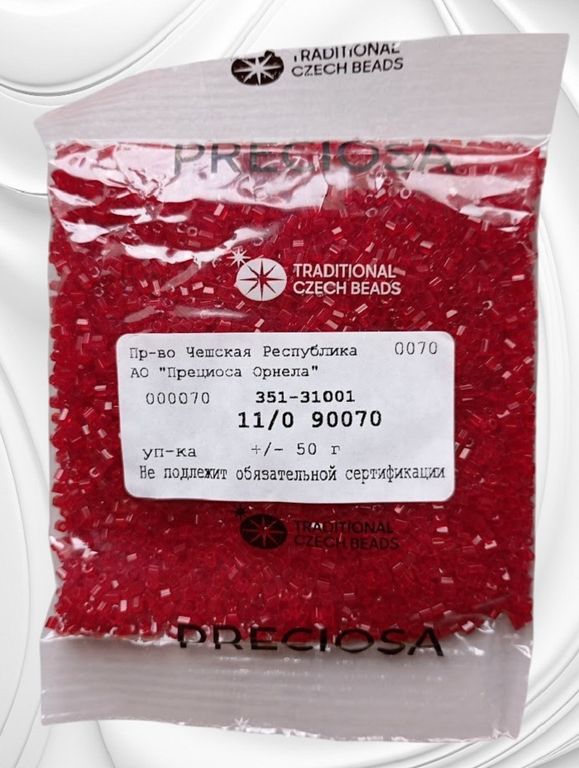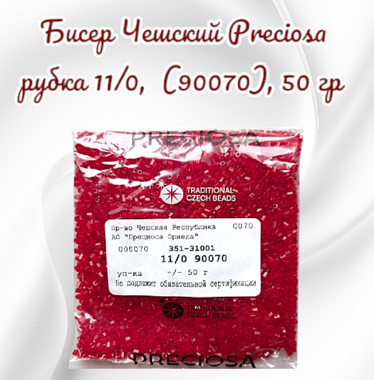 Размер 11/0, цвет красная прозрачная (90070), продается фасовкой по 50 грамм. Производитель: Прециоза, Чехия.