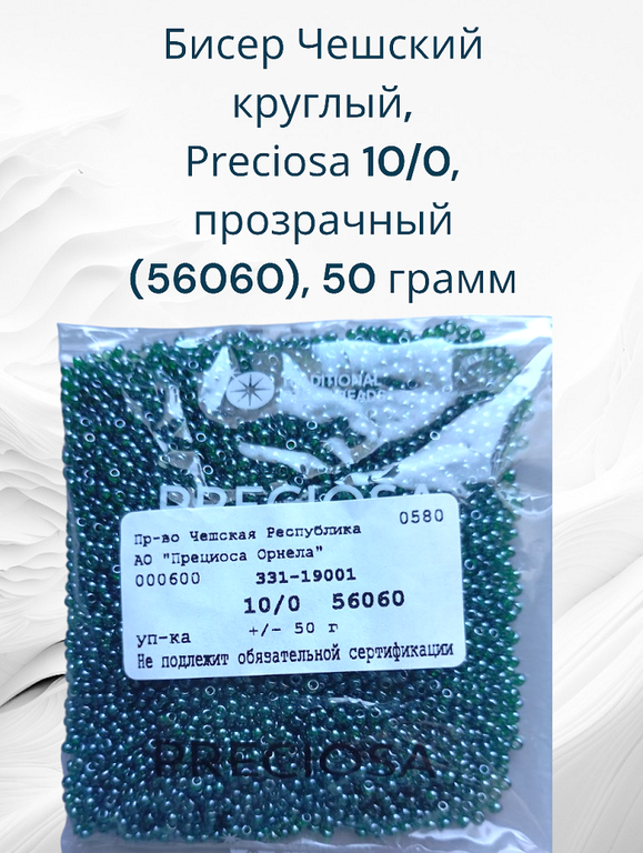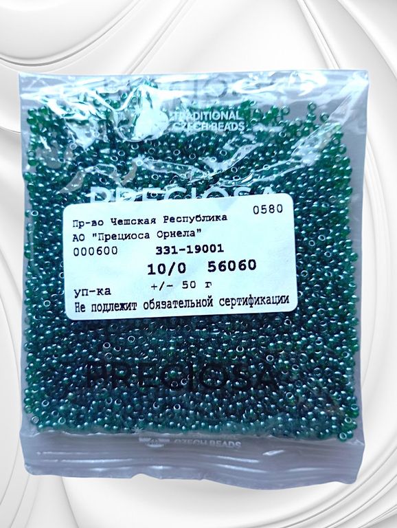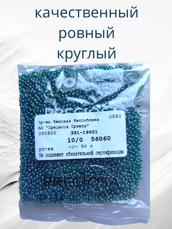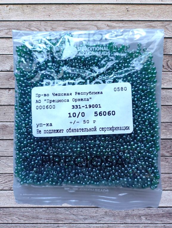 Размер 10/0, цвет темно-зеленый (56060), продается фасовкой по 50 грамм. Производитель: Прециоза, Чехия.